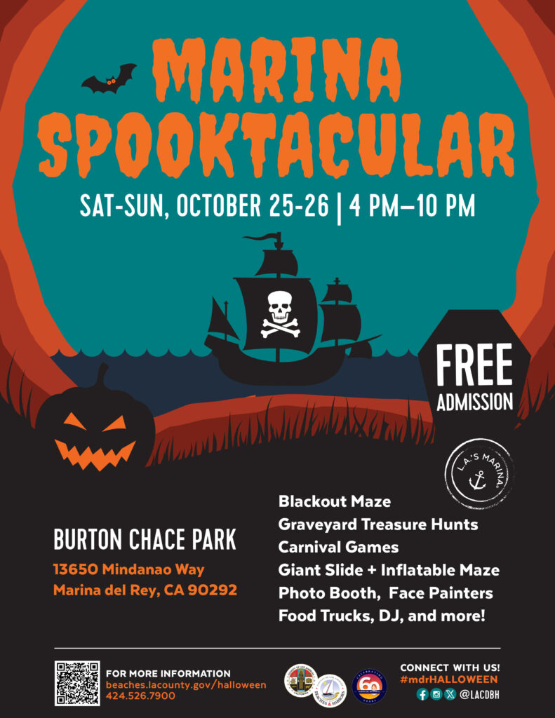 Join us for two days of fun and scares for all ages at Burton Chace Park in Marina del Rey on Saturday and Sunday, October 25–26, from 4 PM to 10 PM. Admission is free, and everyone is welcome! The thrills grow spookier as night falls—don’t miss it!